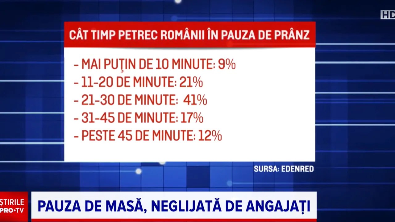 Petru, de profesie chinetoterapeut, spune că multă vreme nu a respectat pauza de masă. Un studiu realizat în România arată că cei mai mulți angajați petrec 30 de minute sau mai puțin pentru a lua masa. Specialiștii recomandă, în medie, o oră. Studiul mai arată că 7 din 10 angajați iau masa de prânz în fața calculatorului, timp în care continuă să lucreze sau navighează pe internet. Specialiștii recomandă să nu ne lăsăm distrași de alte activități. Cei mai mulți salariați alocă, în medie, 40 de lei pentru masa de prânz. Doar 8% sunt dispuși să plătească mai mult, potrivit Știrile Pro TV.