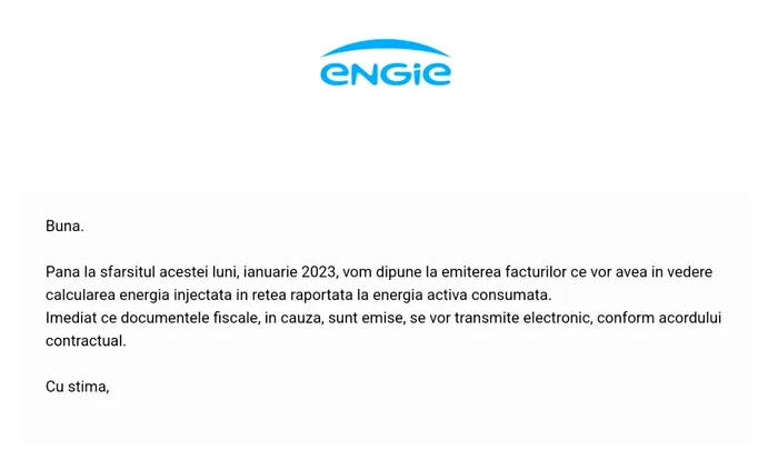 În data de 02.02.2023 am scris din nou o sesizare( nr.1933826)la care raspunsul a fost ca voi fi instiintat imediat ce vor avea un răspuns nemaifiind specificat de data aceasta un termen. Menționez ca din octombrie nici pentru furnizarea de gaze nu am primit factura. De asemenea as dori sa va informez ca am prieteni, prosumatori în contract cu ENGIE, care au primit facturi.