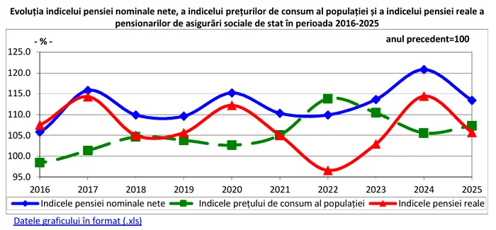 INS a calculat raportul dintre pensia medie nominală netă de asigurări sociale de stat pentru limită de vârstă cu stagiu complet de cotizare și câștigul salarial mediu net, care a fost de 63,1%, comparativ cu 53,9% în anul precedent. De asemenea, indicele pensiei medii reale a pensionarilor de asigurări sociale de stat, calculat ca raport între indicele pensiei nominale nete pentru calculul pensiei reale și indicele prețurilor de consum, a fost de 105,7%.