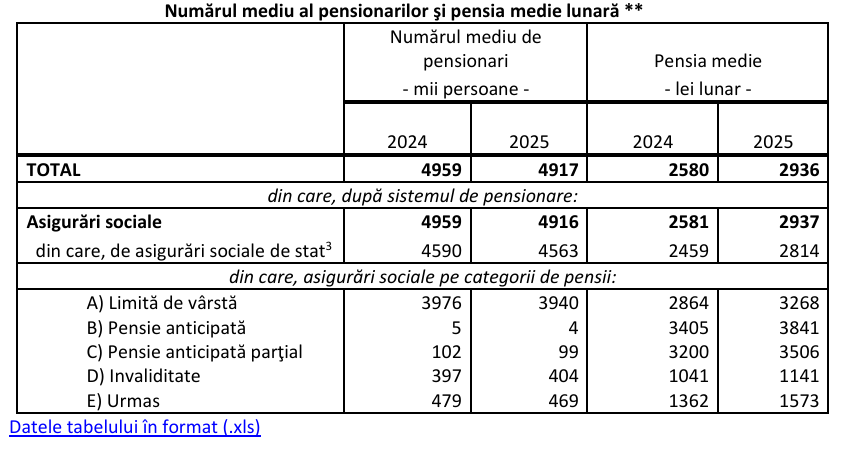 Potrivit datelor publicate de INS, pensia medie lunară, luând în calcul sumele brute plătite de casele de pensii pentru toate categoriile de pensionari, de asigurări sociale, pensii I.O.V.R și ajutorul social, a fost de 2.936 lei, în creștere cu 13,8% față de anul precedent. De asemenea, pensia medie lunară de asigurări sociale de stat a fost de 2.814 lei, în creștere cu 14,4% față de 2024, arată aceleași date.