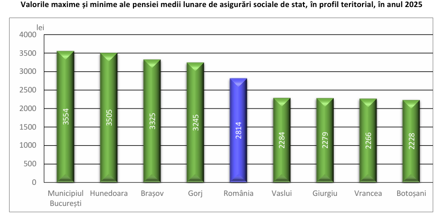 Cele mai mici valori ale pensiei medii lunare de asigurări sociale de stat s-au înregistrat în judeţele Botoşani, 2.228 lei, Vrancea, 2.266 lei, Giurgiu, 2.279 lei şi în Vaslui, 2.284 lei. La polul opus, cele mai mari valori ale pensiei medii lunare de asigurări sociale de stat s-au înregistrat în Municipiul Bucureşti, 3.554 lei, Hunedoara, 3.505 lei, Braşov, 3.325 lei şi Gorj, 3.245 lei.