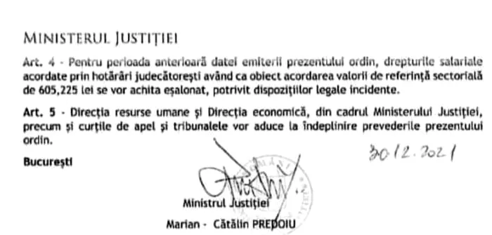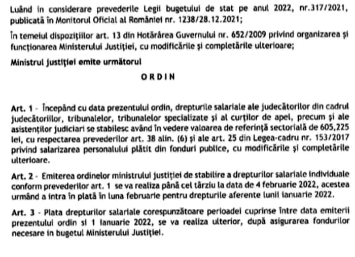 În sistemul judiciar din România, una dintre problemele care au fost rezolvate, prioritar, de către ministrul Justiției, Cătălin Predoiu, și care – susține acesta – crease, de multă vreme, o situație foarte dificilă, deoarece de ani de zile inechitățile din sistem se regăseau în sute de procese deschise de magistrați, o reprezintă Ordinul de ministru dat la finalul anului 2021, referitor la salarizarea magistraților.