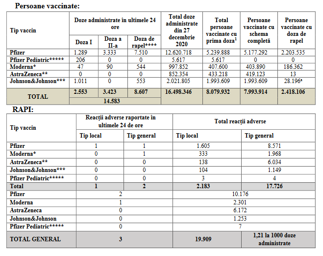 Conform datelor furnizate de Institutul Național de Sănătate Publică (INSP), prin aplicația Registrul Electronic Național al Vaccinărilor, joi, la ora 17.00, numărul total de doze administrate de vaccin împotriva COVID-19 (începând cu data de 27 decembrie 2020) a ajuns la 16.498.346.