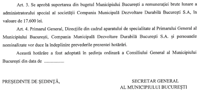 Un alt proiect alflat pe ordinea de zi prevede stabilirea, din bugetul Municipalități, a remuneraţiei brute lunare a administratorului special al Companiei Municipale Dezvoltare Durabilă Bucureşti SA în valoare de 17.600 de lei.