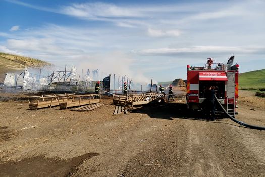 Salvatorii au reușit să localizeze incendiul, după două ore, înainte ca flăcările izbucnite la clădirea în care se aflau animalele să ajungă la un depozit plin cu peste 1.000 de baloți de furaje.