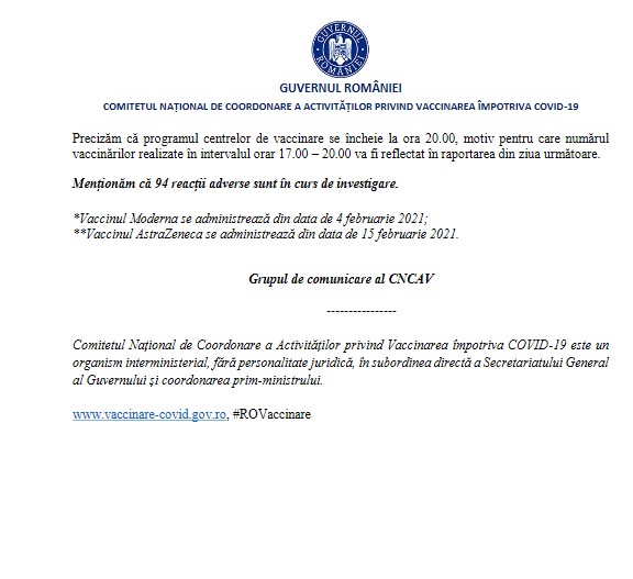 În ultimele 24 de ore au fost raportate 124 de reacții adverse. Totalul reacțiilor adverse este de 11.133 (3,4 / 1.000 doze de vaccin administrate).