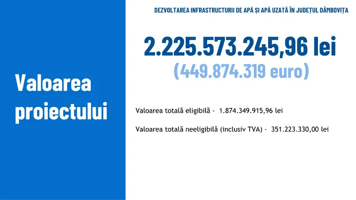 Cel mai mare proiect finanțat prin Programul Operațional Infrastructura Mare, în valoare de 450 de milioane de euro, a fost semnat, în weekend, de președintele Consiliului Județean Dâmbovița, Corneliu Ștefan. Banii vor fi folosiți pentru implementarea proiectului regional de dezvoltare a infrastructurii de apă și apă uzată din județul Dâmbovița.