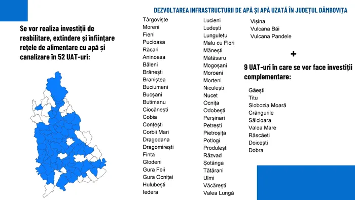 “În mai puțin de un an, am reușit deblocarea acestui proiect foarte important pentru Dâmbovița. Pe lângă rețelele de apă și canalizare, construim opt stații de tratare, două ștații noi de epurare și 17 rezervoare de înmagazinare a apei potabile”, a declarat președintele Consiliului Județean, Corneliu Ștefan.