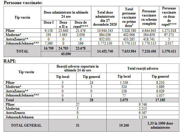 În total, România are 7.633.984 de persoane vaccinate, din care 7.218.456 cu schema completă și 1.370.411inclusiv cu a treia doză.