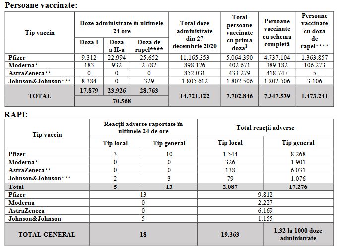 7.702.846 de persoane au fost vaccinate până acum cu prima doză, 7.347.539 au schema completă de vaccinare, iar 1.473.241 au și doza a treia.