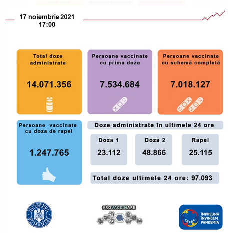 Comitetul Naţional de Coordonare a Activităţilor privind Vaccinarea împotriva COVID-19 (CNCAV) a anunțat miercuri, 17 noiembrie, că 97.093 de persoane au fost vaccinate în ultimele 24 de ore, peste 23.000 fiind la prima doză. În ultimele 24 de ore, au fost 30 de reacţii adverse la vaccinare.
