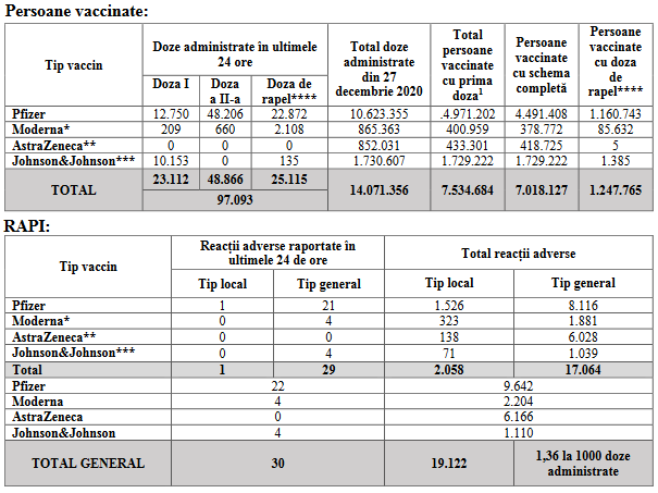 În ultimele 24 de ore au fost 30 de reacţii adverse la vaccinare. În ceea ce priveşte numărul total de reacţii adverse înregistrate la nivelul centrelor de vaccinare, începând din 27 decembrie 2020, sunt 19.122 de reacţii comune şi minore. 213 reacții adverse sunt în curs de investigare.