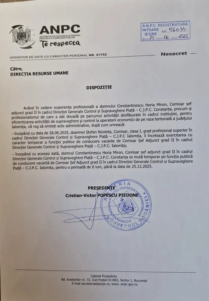 În perioada 26.06.2025-25.12.2025, șeful Comisariatului Județean pentru Protecția Consumatorilor din Constanța, Horia Constantinescu, va pleca la Ialomița, unde va deveni, temporar, șeful instituției omoloage. Ordinul a fost semnat de șeful Autorității Naționale, Cristian Popescu Piedone.