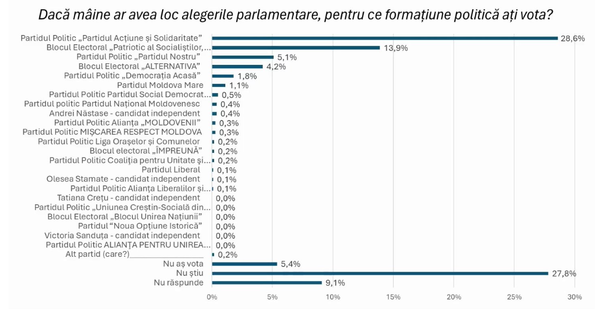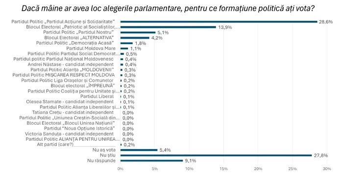 Potrivit voceabasarabiei.md, partidul Maiei Sandu – „Acțiune și Solidaritate” – ar obține 28,6% din voturi.