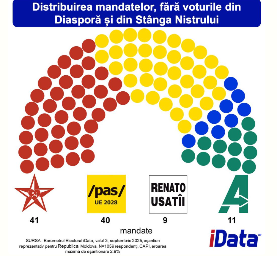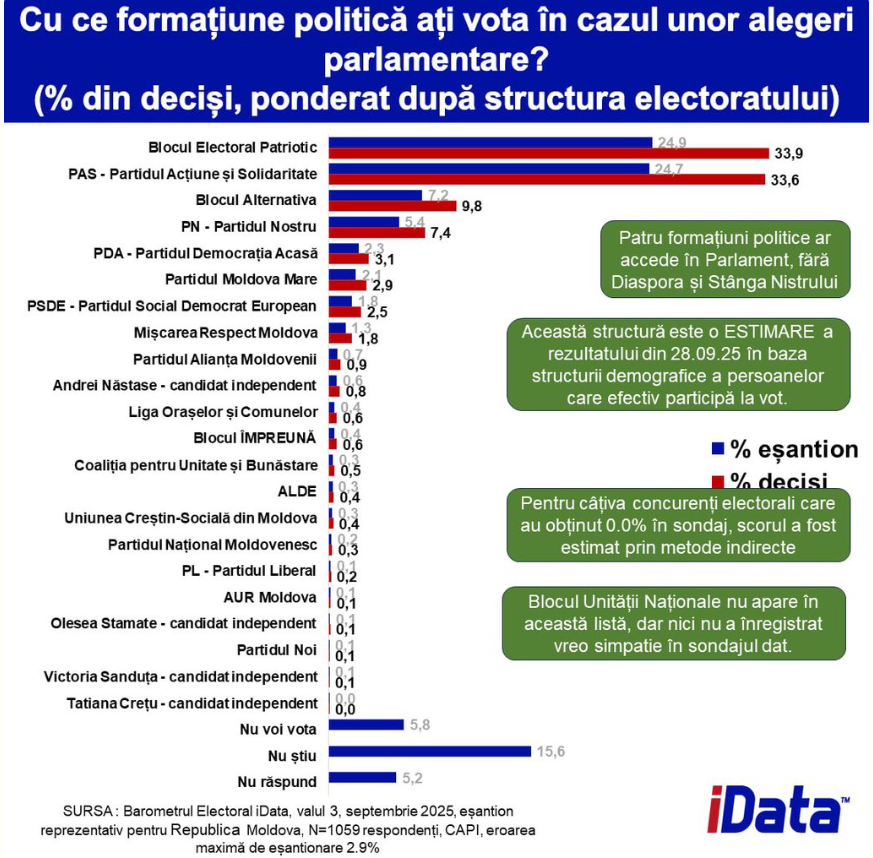 iData a dat publicității – în data de 8 septembrie 2025 – un sondaj din care reiese că pe primul loc în opțiunile alegătorilor se află Blocul „Patriotic”, format de socialiști, comuniști, de partidul fostei bașcane a Găgăuziei, Irina Vlah, și de cel al fostului premier Vasile Tarlev.