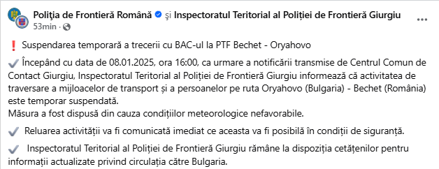 „Începând cu data de 08.01.2025, ora 16:00, ca urmare a notificării transmise de Centrul Comun de Contact Giurgiu, Inspectoratul Teritorial al Poliției de Frontieră Giurgiu informează că activitatea de traversare a mijloacelor de transport și a persoanelor pe ruta Oryahovo (Bulgaria) – Bechet (România) este temporar suspendată. Măsura a fost dispusă din cauza condițiilor meteorologice nevaforabile”, a transmis Poliția de Frontieră.