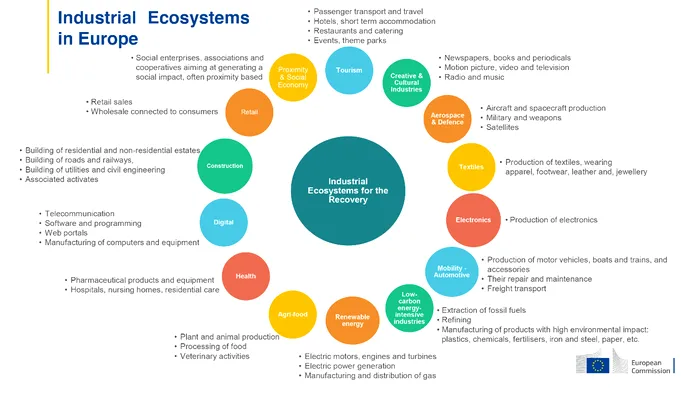 Comisia Eriopeana a identificat 14 ecosisteme industriale cu un marcat caracter paneuropean. Compoziția lor este foarte eterogenă în ceea ce privește compoziția sectorială, dimensiunea și domeniul de aplicare.