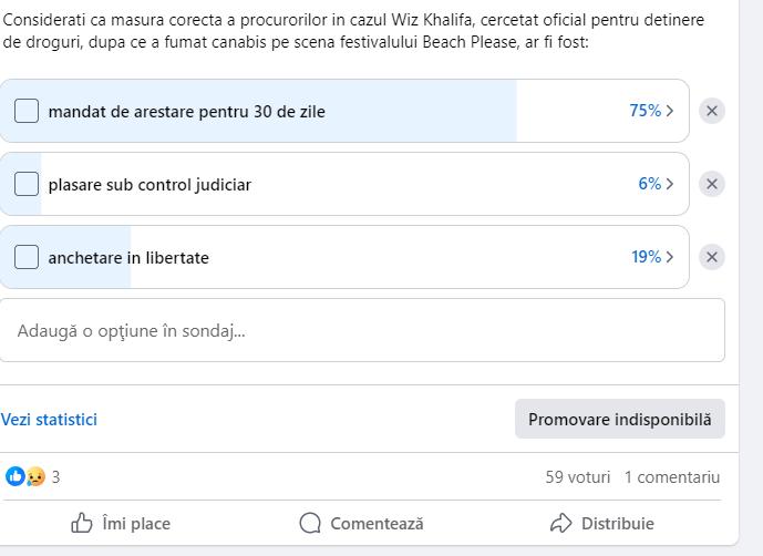 Majoritatea respondenților (75%) este de părere că procurorii ar fi trebuit să ia măsura arestării preventive pentru 30 de zile în cazul rapperului american Wiz Khalifa, în timp ce doar 19% consideră că decizia anchetării în libertate este corectă.