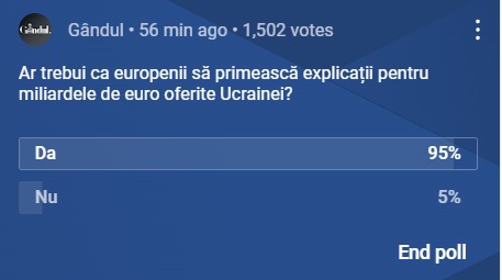 „Ar trebui ca europenii să primească explicații pentru miliardele de euro oferite Ucrainei?”. Vezi ce au răspuns telespectatorii emisiunii „Marius Tucă Show”, la poll-ul propus în ediția de miercuri, 20 martie.