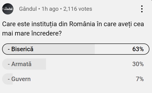 „Care este instituția din România în care aveți cea mai mare încredere?”. Aceasta a fost întrebarea serii, la emisiunea „Marius Tucă Show” de luni, 14 octombrie, fiind propuse trei variante de răspuns.