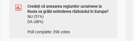 Astfel, publicul a fost invitat să răspundă cu DA sau NU la întrebarea „Credeți că anexarea regiunilor ucrainene la Rusia va grăbi extinderea războiului în Europa?”
