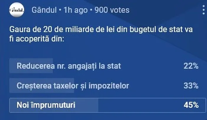 În această seara, telespectatorii emisiunii „Marius Tucă Show” au fost întrebați „cum va fi acoperită „gaura” de 20 de miliarde de lei din bugetul de stat” și au avut la dispoziție trei variante.