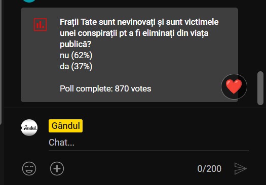 „Frații Tate sunt nevinovați și sunt victimele unei conspirații pentru a fi eliminați din viața publică?” Aceasta a fost întrebarea propusă la poll-ul emisiunii „Marius Tucă Show” de luni, 17 iulie, fiind oferite două variante de răspuns.