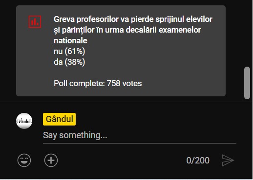 Poll-ul emisiunii „Marius Tucă Show” de luni, 5 iunie, a propus următoarea întrebare: „Greva profesorilor va pierde sprijinul elevilor și părinților în urma decalării examenelor naționale?”.