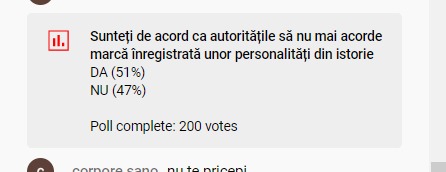 Cei mai mulți dintre telespectatorii care au răspuns la întrebare (51%) sunt de părere că autoritățile ar trebui să nu mai acorde marcă înregistrată unor personalități din istorie. Doar 47% dintre respondenți susțin cealaltă variantă.