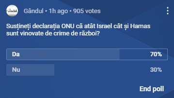 Află ce au răspuns telespectatorii emisiunii „Marius Tucă Show”, în seara zilei de joi, 9 noiembrie, la întrebarea…„Susțineți declarația ONU că atât Israel cât și Hamas sunt vinovate de crime de război?”