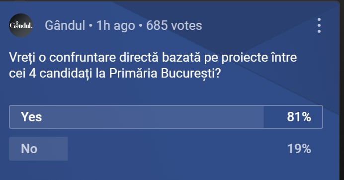 În emisiunea Marius Tucă Show de joi, 25 aprilie, la ediția specială de la ora 17:00, în care invitată a fost Gabriela Firea, candidata PSD la Primăria Capitalei, întrebarea poll-ului a fost următoarea: „Vreți o confruntare directă bazată pe proiecte întrei cei patru candidați la Primăria Capitalei?”.