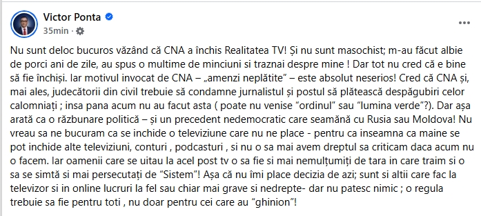 Printr-o postare pe pagina sa de Facebook, Victor Ponta a comentat decizia CNA de a închide postul de televiziune Realitatea Plus. Fostul premier al României a transmis că, în ciuda faptului că postul TV l-a criticat de-a lungul timpului, decizia Consiliul Național al Audiovizualului nu îl încântă.