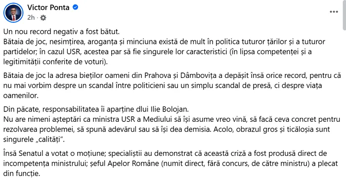 Ponta a subliniat faptul că situația actuală depășește un simplu conflict politic și afectează direct viața oamenilor. De asemenea, fostul premier a precizat că USR a stabilit „un nou record negativ” prin modul în care partidul a gestionat criza.