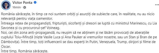 Ponta: „România sărăcește, în timp ce noi suntem orbiți de fripturiști și sicofanți. Cuplul Țoiu–Mîruță sau un Stan și Bran de pe Dâmbovița”