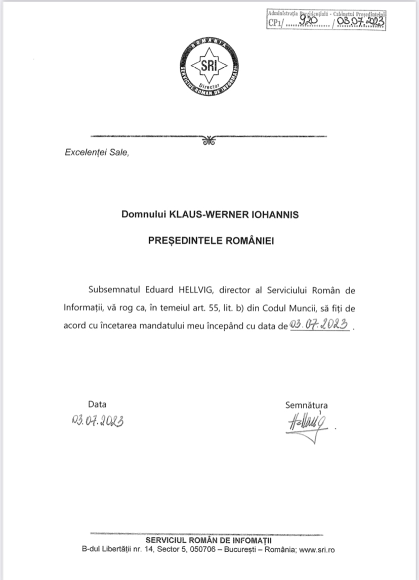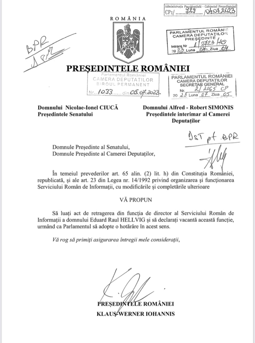 Klaus Iohannis le-a solicitat marți președinților celor două camere din Parlament, Nicolae Ciucă și Alfred Simonis să anunțe oficial vacantarea postului de director al SRI, în urma demisiei lui Eduard Hellvig.