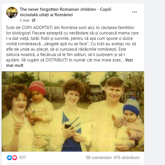 Peste o mie de persoane din străinătate adoptate din România în urmă cu mai bine de 30 de ani au reuşit să îşi găsească părinţii biologici prin intermediul unei pagini de Facebook: ”The never forgotten Romanian children – Copiii niciodată uitați ai României”. Totul a început cu dorința unei românce stabilite în Irlanda, Ileana Cunniffe Băiescu, care nu s-a dat bătută și a vrut să-și găseasc fratele adoptat în urmă cu 28 de ani.