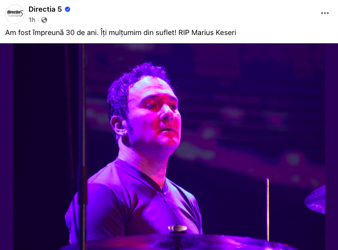 „Am fost împreună 30 de ani. Îți mulțumim din suflet! RIP Marius Keseri”. Asta a anunțat trupa Direcția 5 miercuri în mediul online. Toboșarul avea 60 de ani și a fost alături de trupă timp de trei decenii.