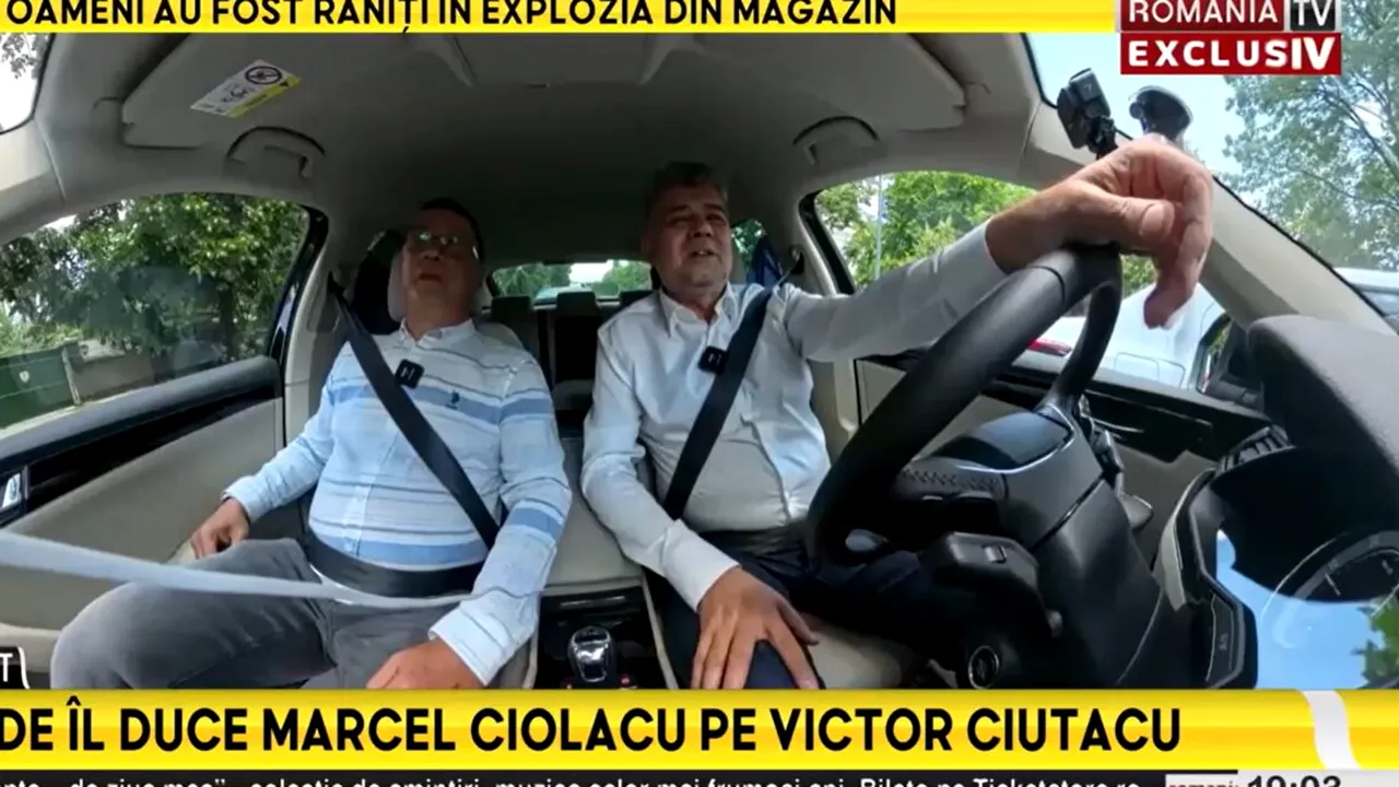 Cu premierul Marcel Ciolacu la volan și ziaristul Victor Ciutacu de la RTV, în dreapta, a început aventura celor doi prin aglomeratul Municipiu București. Ca să se asigure că se pricepe la șofat, Ciutacu l-a întrebat în treacăt cam de când are permisul și cam cu ce rezultate.