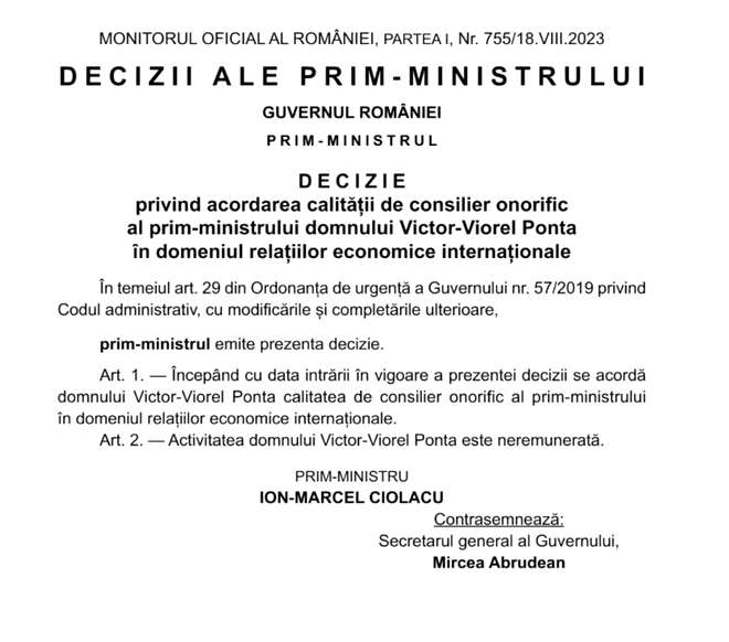Fostul premier Victor Ponta a fost numit, vineri, consilier onorific al prim-ministrului Marcel Ciolacu în domeniul relațiilor economice internaționale.