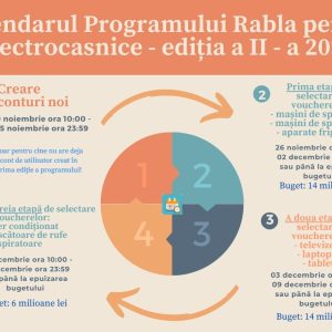Bugetul alocat acestei etape este de 14 milioane lei, iar de vineri dimineaţa persoanele fizice au posibilitatea să intre în contul de utilizator creat şi să genereze vouchere pentru categoria de electrocasnice dorite.
