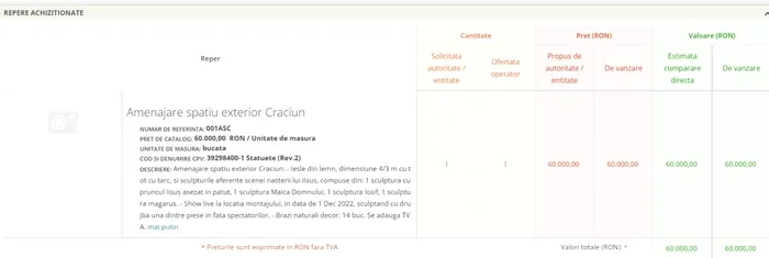 „Amenajare spațiu exterior Crăciun: – Iesle din lemn, dimensiune 4/3 m cu tot cu țarc, și sculpturile aferente scenei nașterii lui IIsus, compuse din: 1 sculptură cu pruncul Iisus așezat în pătuț, 1 sculptură Maică Domnului, 1 sculptură Iosif, 1 sculptură măgăruș. – Show live la locația montajului, în dată de 1 Dec 2022, sculptând cu drujbă una dintre piese în față spectatorilor. – Brazi naturali decor: 14 buc. Se adaugă TVA”, este anunțul publicat de primărie pe SEAP.