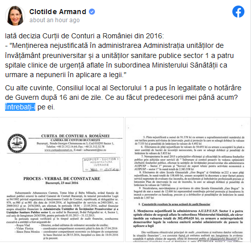 Primarul Sectorului 1, Clotilde Armand, a reacționat joi seară, tot pe Facebook, prin care precizează că decizia de ieri a Consiliul local al Sectorului 1 a pus în legalitate o hotărâre de Guvern, după 16 ani de zile. În sprijinul celor spuse, edilul a atașat și unele documente în acest sens.