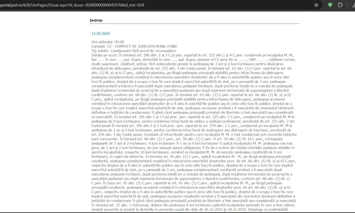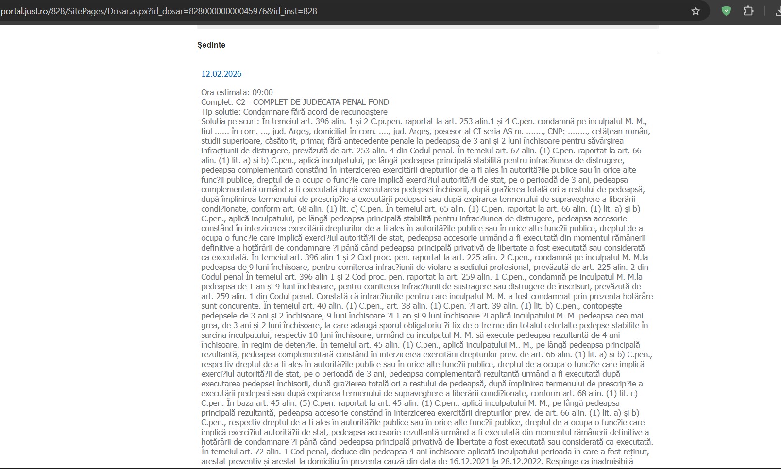 Judecătoria Topoloveni a decis joi, 12 februarie, să îl condamne, în primă instanță, la 3 ani şi 2 luni închisoare pentru săvârşirea infracţiunii de distrugere, la 9 luni închisoare pentru violarea sediului profesional și la un an şi 9 luni închisoare pentru distrugere de înscrisuri.