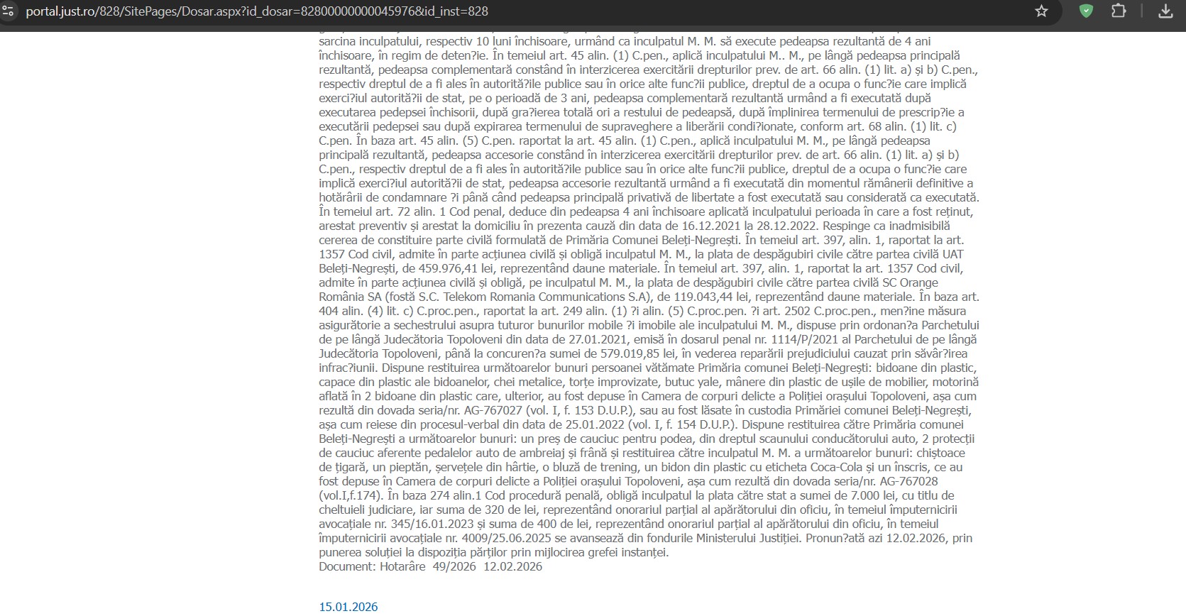 Judecătoria Topoloveni a admis în parte acţiunea civilă şi obligă inculpatul la plata de despăgubiri civile către partea civilă UAT Beleţi-Negreşti, de 459.976,41 lei, reprezentând daune materiale.