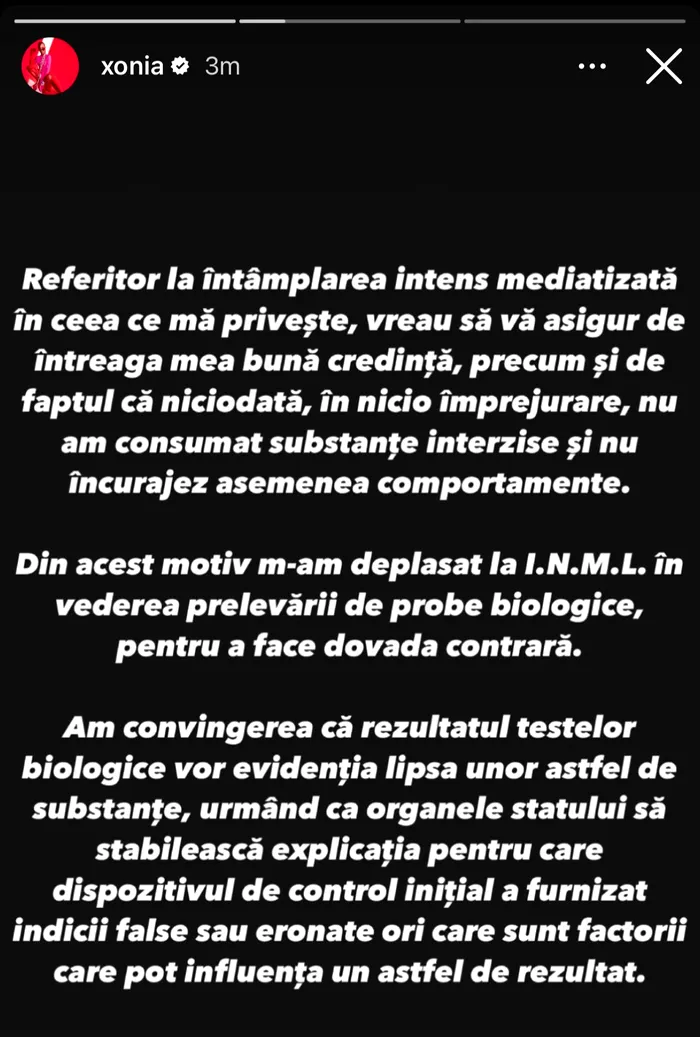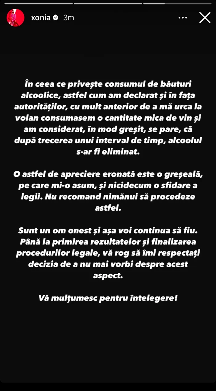 Sunt un om onest și așa voi continua să fiu. Până la primirea rezultatelor și finalizarea procedurilor legale, vă rog să îmi respectați decizia de a nu mai vorbi despre acest aspect. Vă mulțumesc pentru înțelegere!”, mai scrie Xonia.