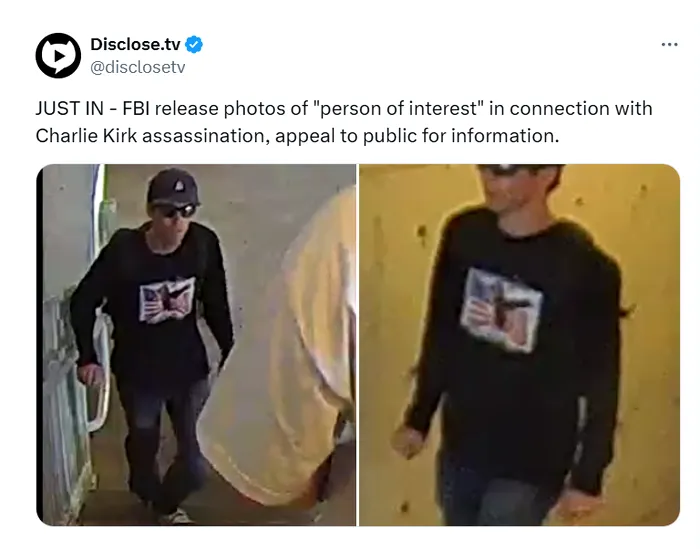 FBI a publicat fotografii cu o „persoană de interes” care l-ar fi ucis pe Charlie Kirk la Universitatea Utah Valley. Charlie Kirk a fost împușcat mortal miercuri la Universitatea Utah Valley. Persoana de interes, de vârstă universitară, a fost surprinsă pe o înregistrare video în timp ce se urca pe acoperișul unui campus. Imaginile publicate de New York Post par să arate pușca folosită pentru uciderea lui Kirk.