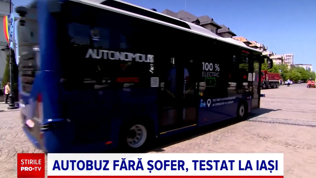 Un autobuz fără șofer a circulat astăzi, în premieră în România, la Iași. Vehiculul folosește inteligența artificială și tehnologii de scanare în timp real. Deocamdată este în teste, dar e folosit cu succes în Norvegia și va fi introdus curând și la Paris. România nu permite, deocamdată, că astfel de vehicule să ruleze pe străzile noastre.