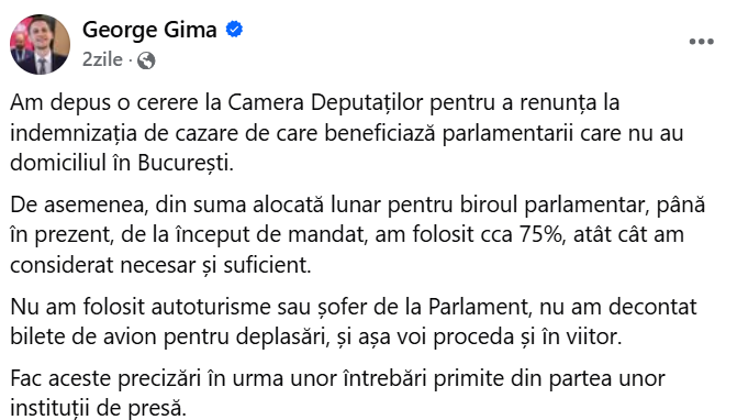 George Gima a încercat, însă, „să dreagă busuiocul”. A încercat să se scuze, spunând că a încasat doar 75% din suma care i s-a alocat pentru chirie. Dar a recunoscut că a fost o greșeală faptul că nu a depus, încă de la început de mandat, o cerere de renunțare la banii pentru chirie. Mai mult, deputatul USR spune că și lucrează, alături de alți doi colegi, la un proiect de modificare a legii, pentru limitarea sumelor alocate chiriilor!