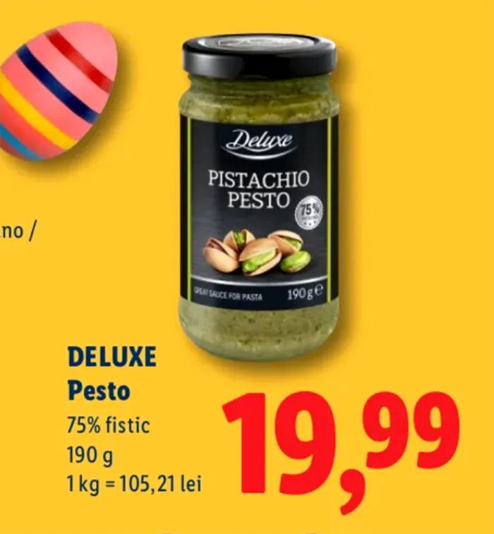 Retailerul german Lidl vinde produsul de lux  pesto de fistic Deluxe cu numai 19,99 lei borcanul.
