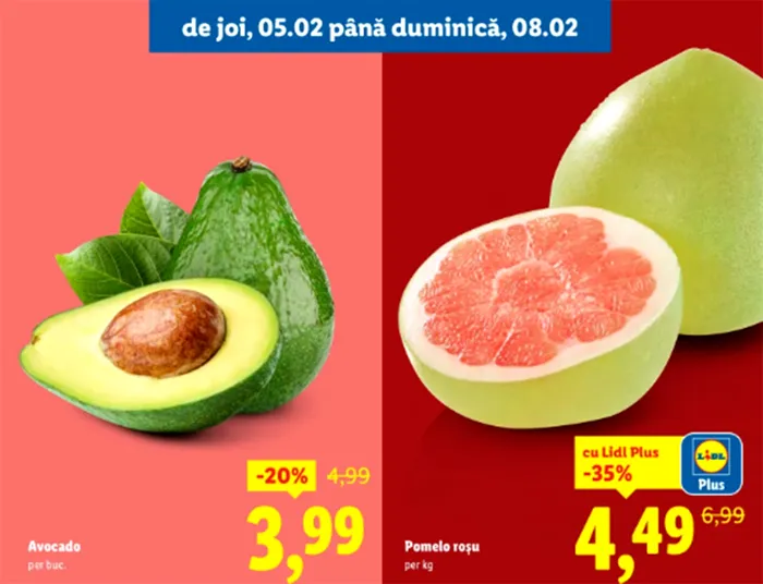 Dar și avocado poate fi cumpărat cu o reducere de 20 %. Acesta se vinde la bucată, iar acum costă 3,99 lei/kilogramul, scăzut de la 4,99 lei/kilogramul.